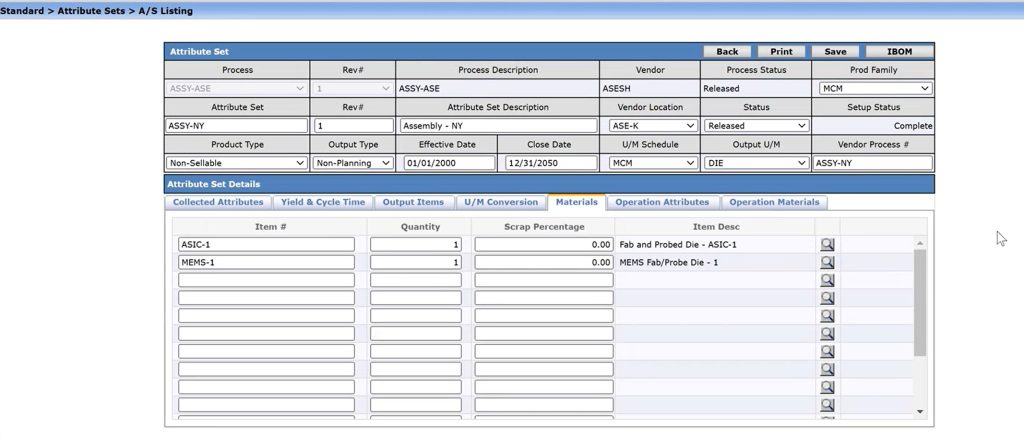 If you want to follow more of a traditional bill of material structure, you can have that as the beginning process. In the screenshot below, you can see that this ASSY part requires an ASIC and MEMS item. Both are probe die but if you check the IBOM for this part, this is the beginning process in the bill of materials. There is no input from an IBOM, it is only the input from the consumed materials. This is more of a traditional bill of material set up in which you have many materials coming together to build one item. You can continue further and test that output part and it can become multiple things and follow more of an IBOM approach.
